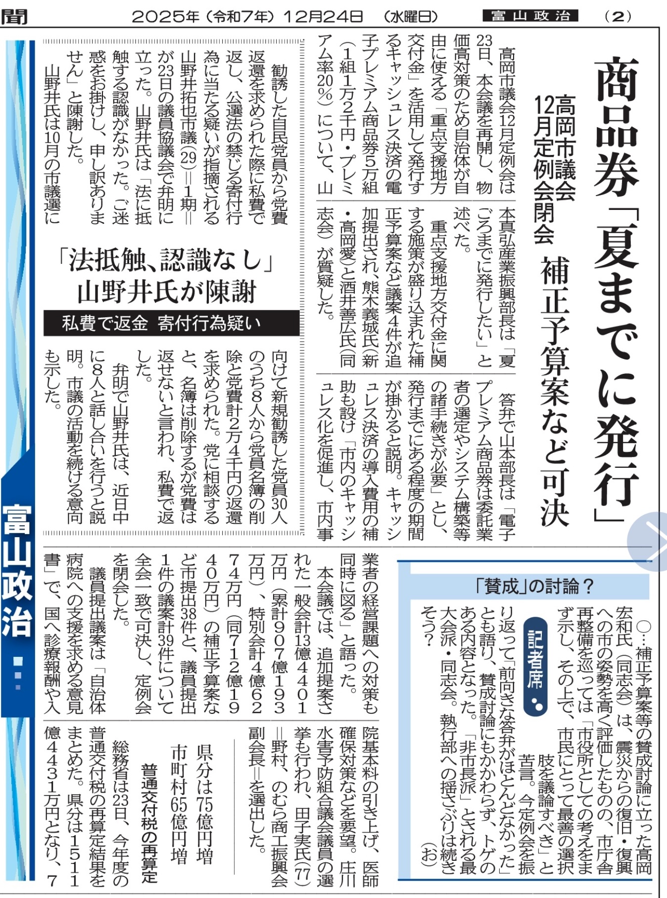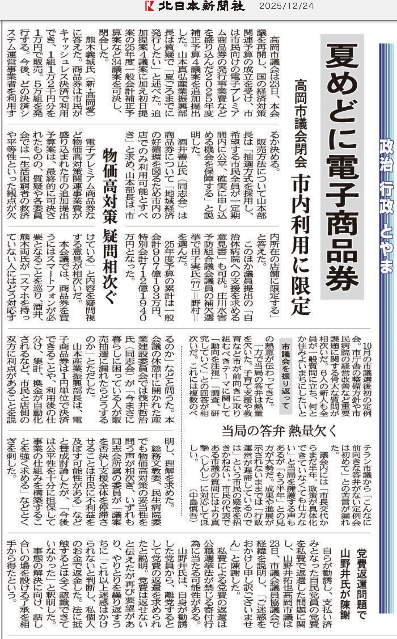 23日 12月定例議会最終日。午前、議員協議会の後、午後から本会議。当日提案された追加提出された国の経済対策の補正予算案などを含め全会一致で可決し閉会しました。細かいことは、下記の記事を読んでいただきたいのですが、不完全燃焼というかモヤモヤした議会だったのは各記者の皆さんはじめ議員も・・・。